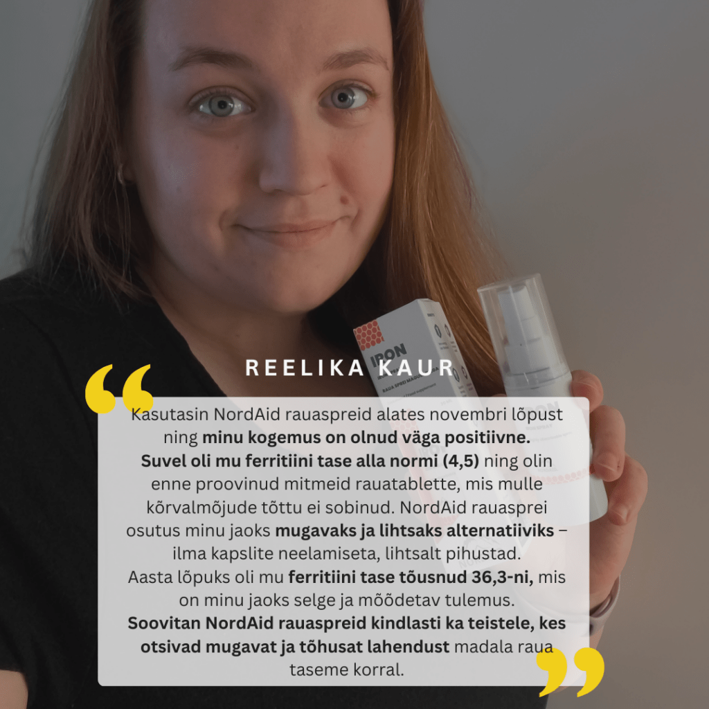 “Tahtsin teid isiklikult tänada, et teil on nii head tooted. Mul on väga tundlik seedesüsteem ja aastaid kannatasin veel rauavaeguse all. Proovisin palju erinevaid rauapreparaate ja ükski ei sobinud, kuna tekitasid ebameeldivaid seedehäireid ning rauatase eriti ei tõusnud. Siis ma leidsin teie raua sprei ja mul pole 10a nii kõrge rauatase olnud (kasutasin 2 kuud järjest: hemoglobiin tõusis 119 pealt 136 peale ning ferritiin kahekordistus). Tunnen ennast lisaks sellele palju paremini, kuna ma ei ole enam nii väsinud ja külmetushaigused ei hakka eriti külge. Vahetasin kõik ülejäänud vitamiinid teie sprei toodete vastu välja. Neid on veel nii mugav kasutada ka. Isegi lapsed on nõus võtma. Jätkake samas vaimus! Minu tervise muutsite paremaks.”