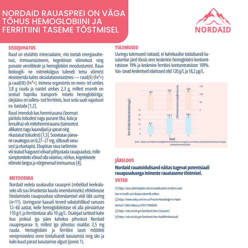 🇪🇪Nordaid Raua sprei on efektiivsema imendumisega kui traditsioonilised tabletid või kapslid kuna jõuab läbi suu limaskesta koheselt vereringesse ja ei tugine seedesüsteemil. Sprei kujul raud tõstab veres väga kiiresti raua taset, seedekulgla vaevusi ja kõhukinnisust tekitamata.