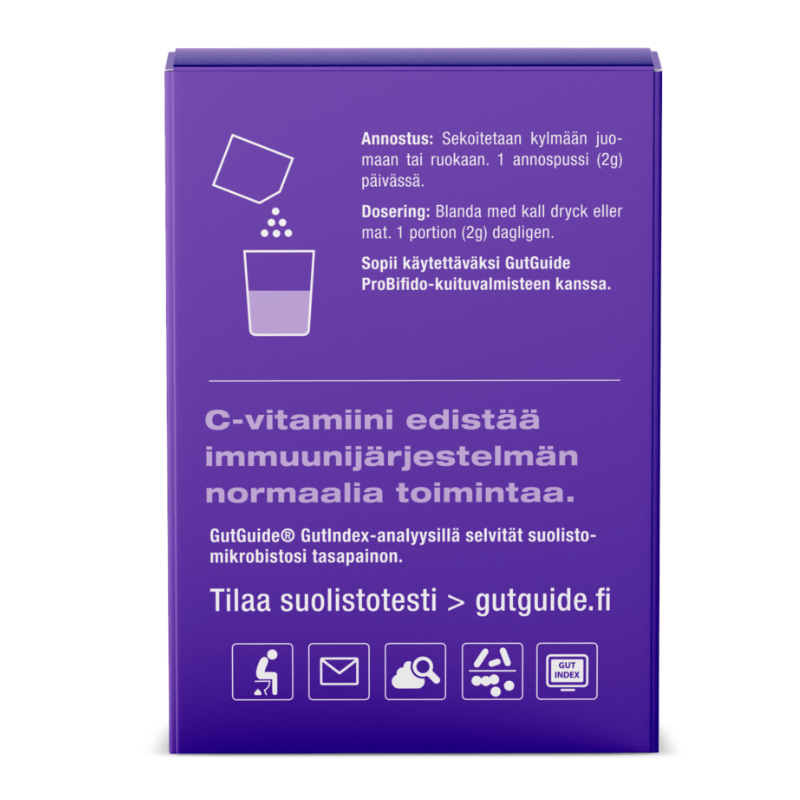🇫🇮 GutGuide probiootikumid ProImmuno sisaldab piimhappebakterite külmkuivatatud pulbrit, C-vitamiini ja maisist eraldatud maltodekstriini.