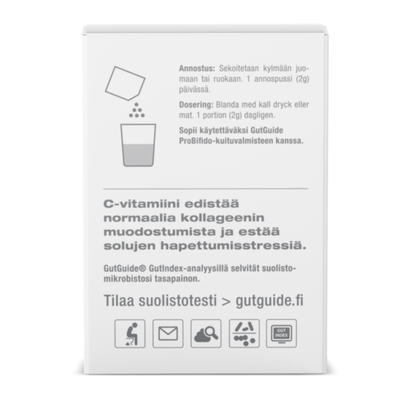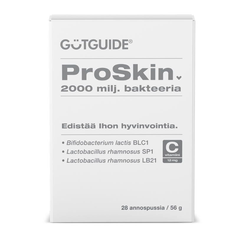 🇫🇮 Probiootikumid GutGuide ProSkin on kolme bakteritüve Bifidobacterium lactis BLC1, Lactobacillus rhamnosus LB21 CS , Lactobacillus rhamnosus SP1 CS ja C-vitamiini kombinatsioon naha heaolule läbi soolestiku.